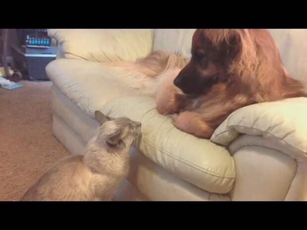 Собака просто лежала на диване и отдыхала. А теперь всё внимание на кота…